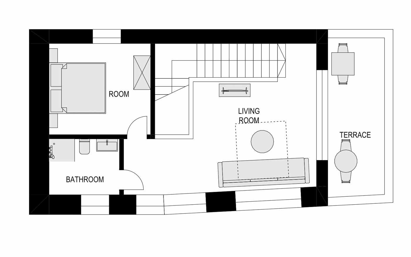 • Terrace shared with the other studio apartments is equipped with outdoor tables and a gas grill