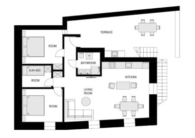 On the first floor, 3 bedroom apartment (75 m2) plus a large terrace (30m2). Air conditioning in all rooms. Outdoor kitchen and a gas grill on the terrace.